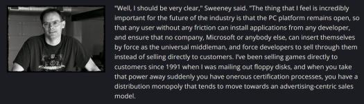 “The thing that I feel is incredibly important for the future of the industry is that the PC platform remains open, so that any user without any friction can install applications from any developer, and ensure that no company, Microsoft or anybody else, can insert themselves by force as the universal middleman, and force developers to sell through them instead of selling directly to customers. “